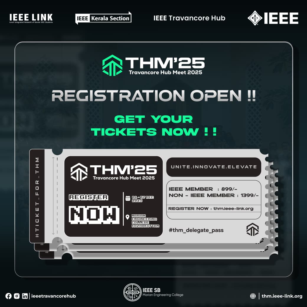 IEEE Travancore Hub Meet (THM)* is the flagship event of IEEE Travancore Hub, bringing together innovators, tech enthusiasts, and student leaders for an immersive experience. With engaging sessions, workshops, and networking opportunities, it offers the perfect space to learn and collaborate—making THM your go-to event.
