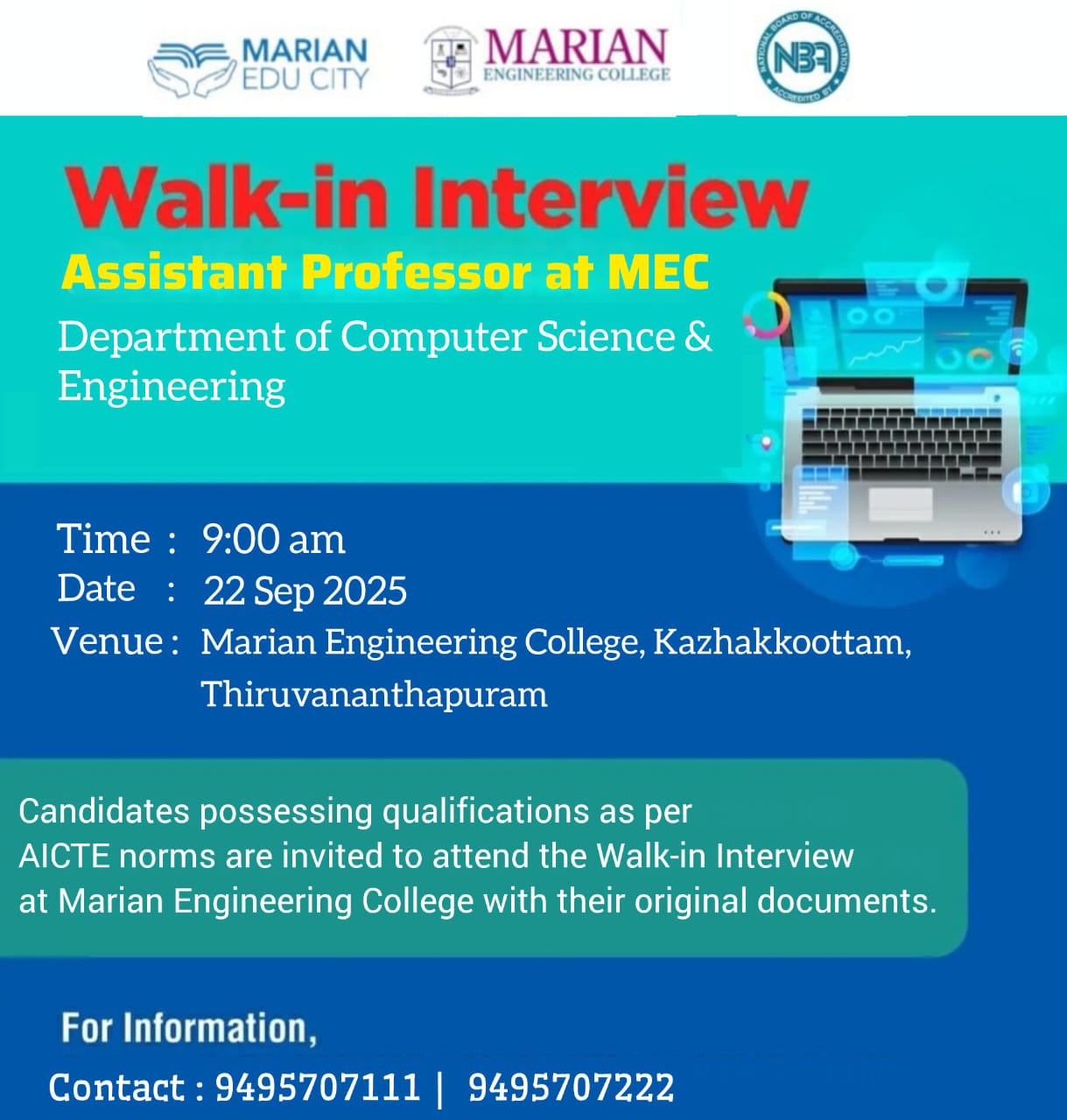 Application with CV shall send to mail@marian.ac.in or by speed post to “ The Manager, Marian Engineering College, Kazhakkuttom, Thiruvananthapuram or directly to the PA to manager.